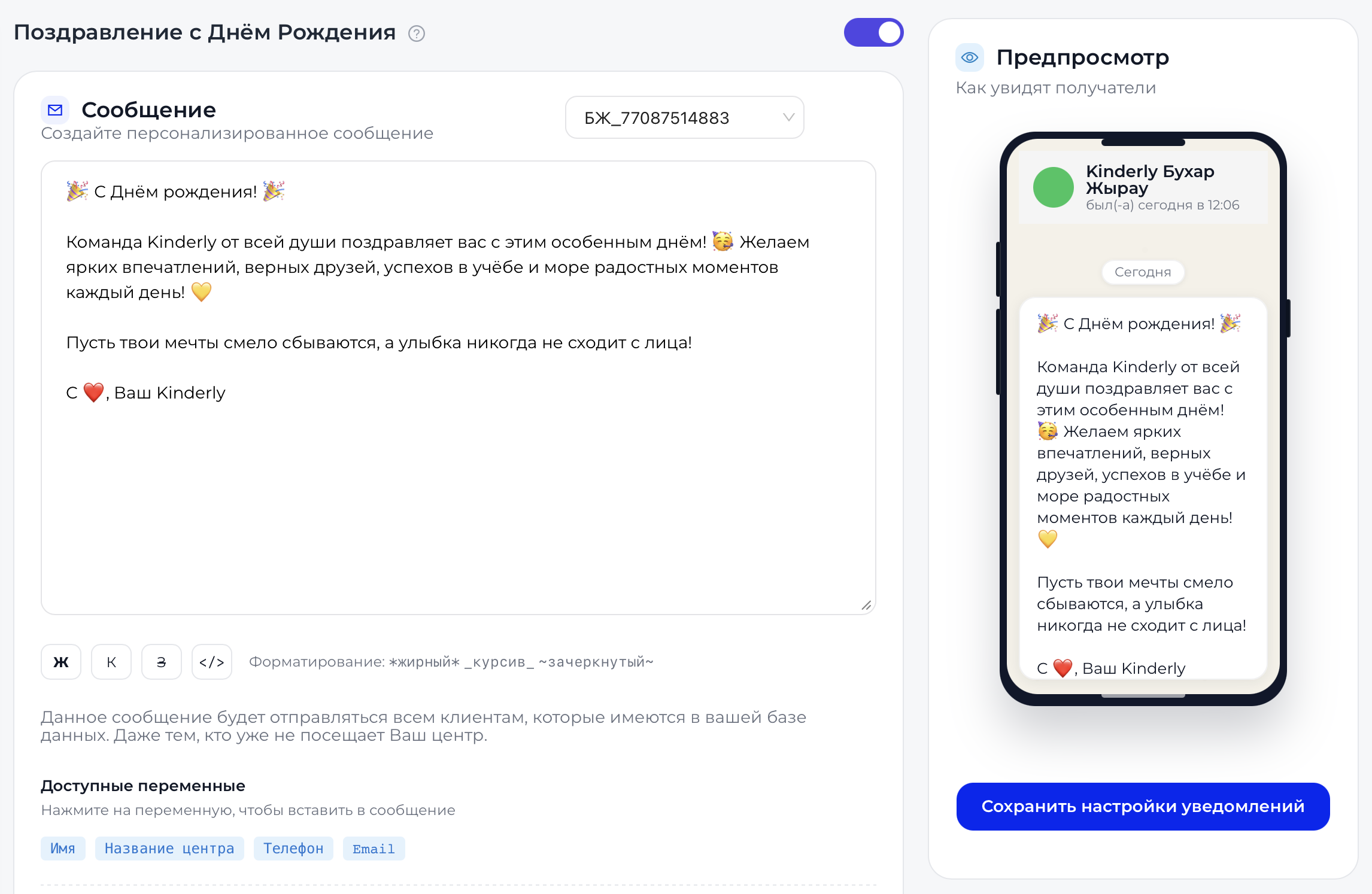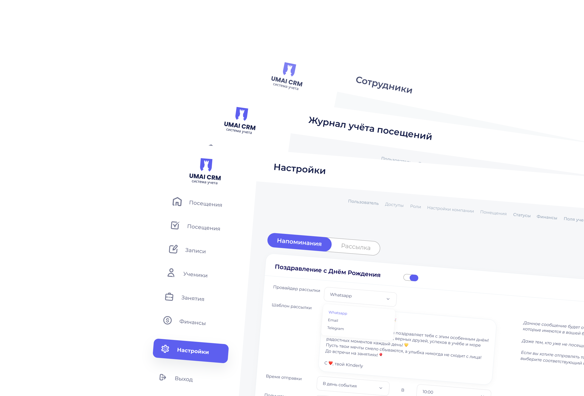 Напоминания, рассылки, поздравления и история отправок - всё внутри системы.