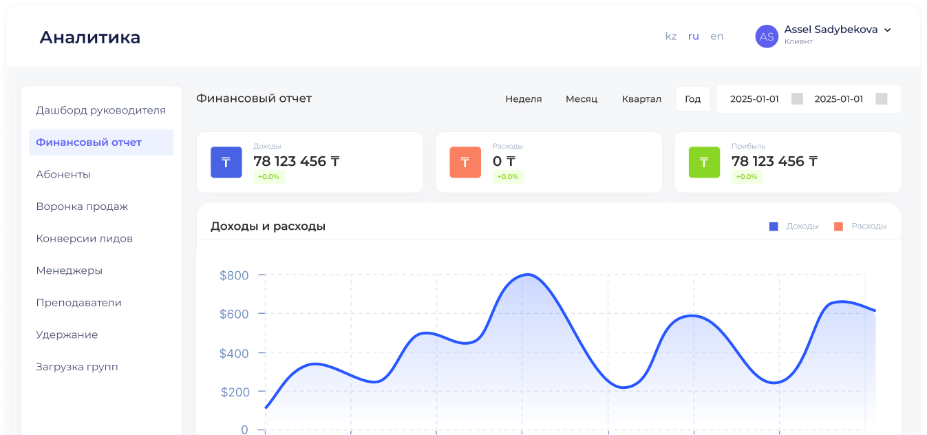 Доступна углубленная аналитика по каждому менеджеру и учителю - коэффициент конверсии, скорость обработки клиентов и время до подписания договора.
