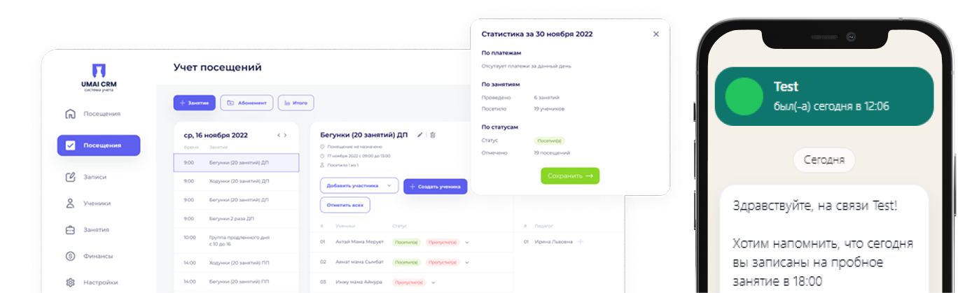 UMAI объединяет в одной системе элементы управления информацией по работе с клиентами или учениками, проведение занятий, контроль сотрудников и финансы центра.
