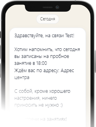 CRM автоматически отправляет напоминания об оплате, окончании абонемента и поздравления с Днём рождения. Сообщения уходят в нужное время по заданным условиям - без ручного контроля.