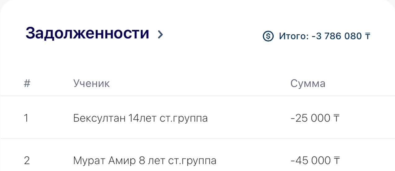 Если ученик оплатил частично, система автоматически покажет задолженность и напомнит администратору.
