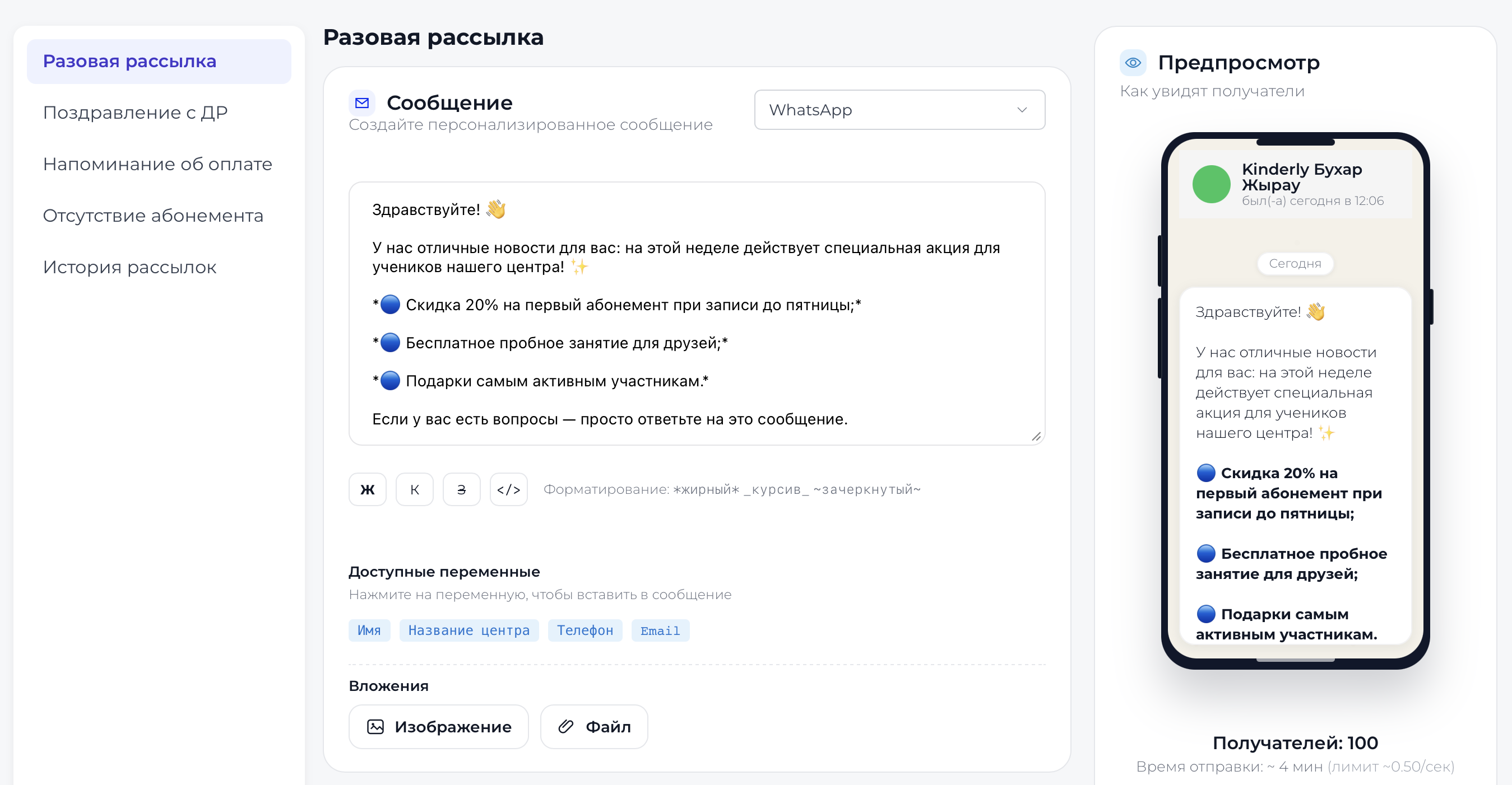 Видео инструкцияСоздавайте массовые сообщения по выбранному сегменту: только активные, все клиенты или отдельные группы. Отправляйте сразу или по расписанию и отслеживайте историю кампаний.