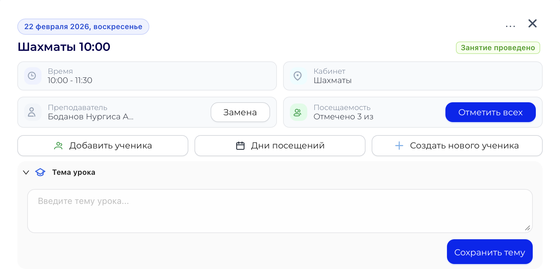 Назначайте замену прямо в занятии без пересоздания урока. Посещаемость, ученики и история занятия сохраняются, а новый преподаватель сразу видит урок в своём расписании.