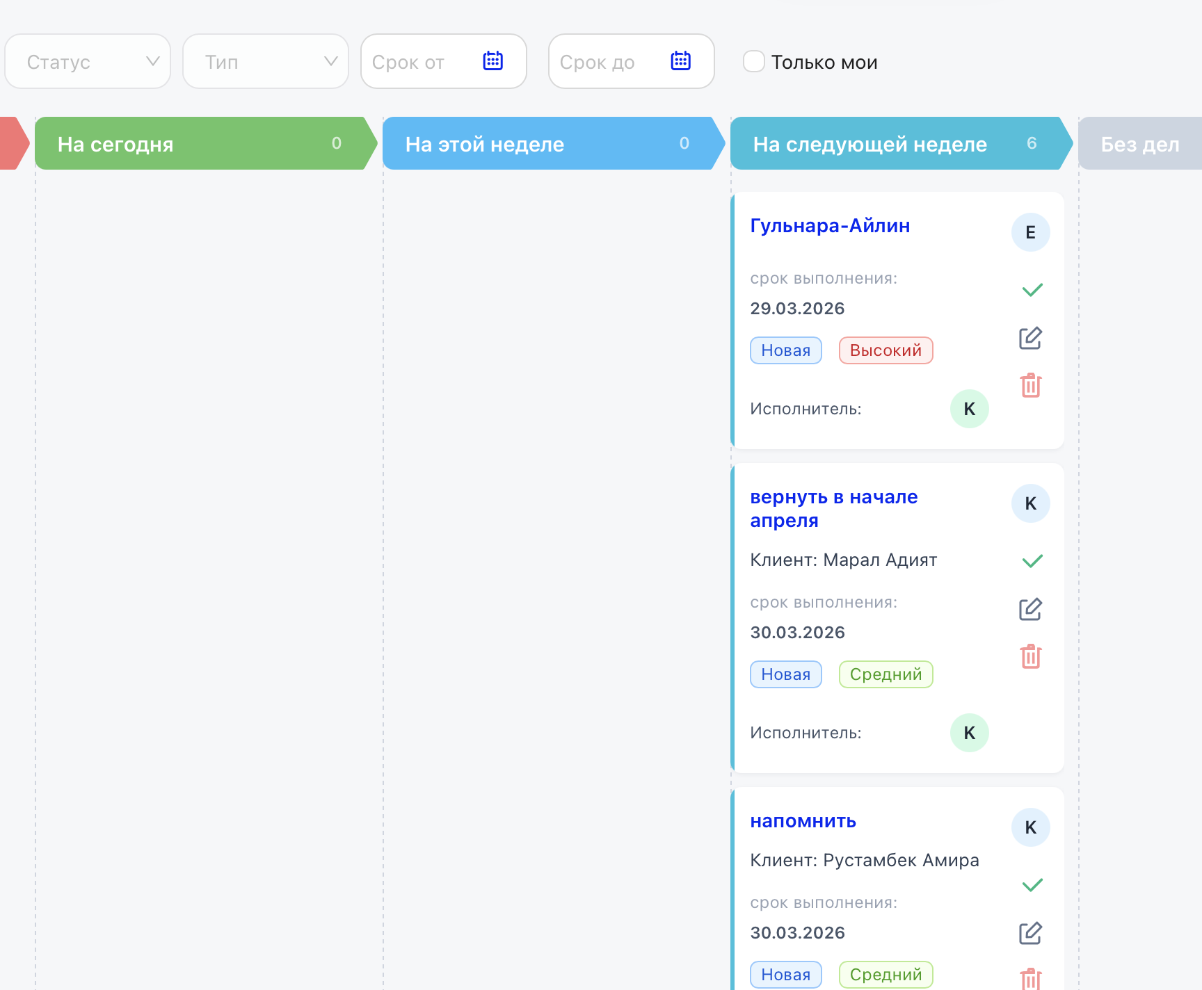 Постановка задач сотрудникам с дедлайнами и приоритетами. Канбан-доска показывает просроченные, текущие и запланированные задачи.
