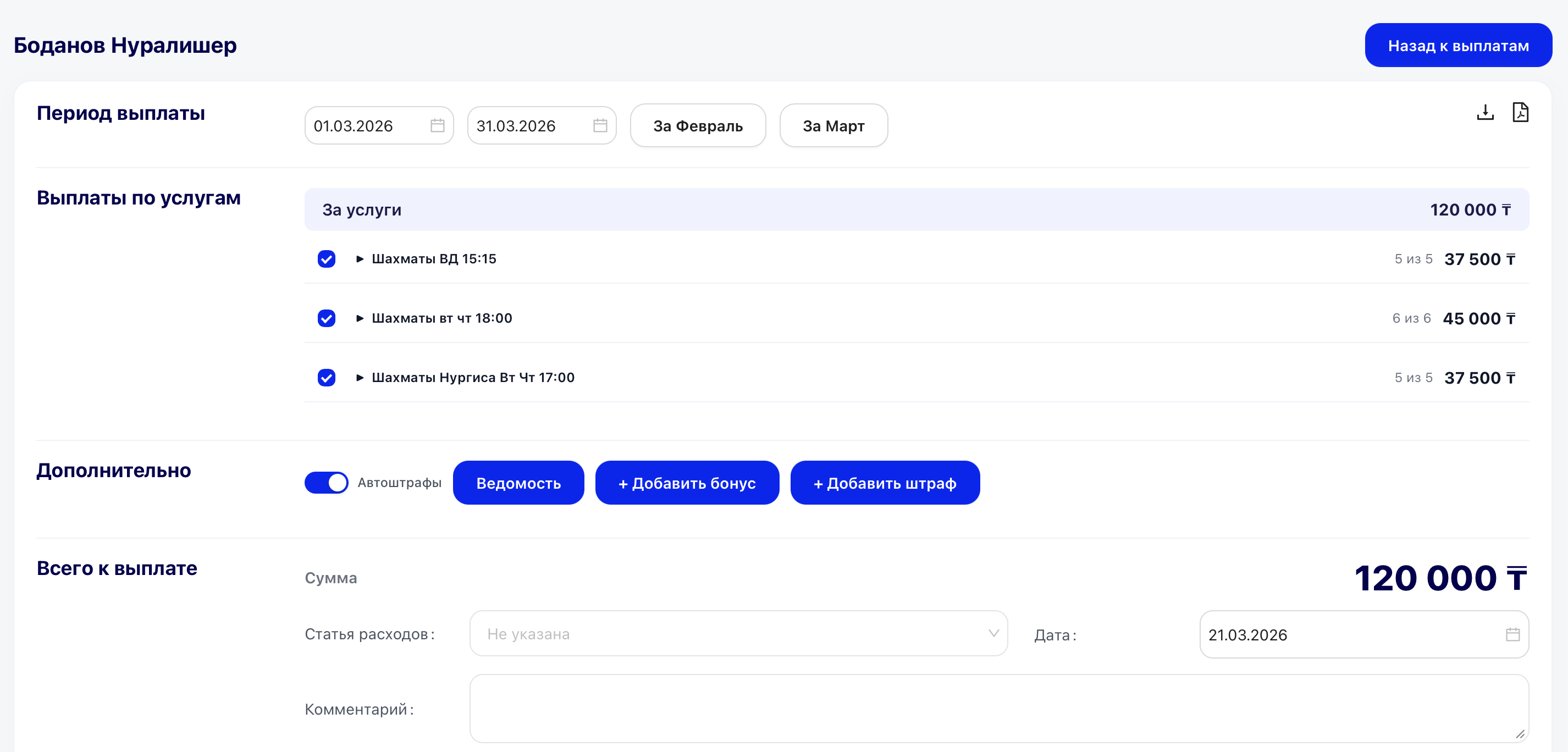 Система автоматически рассчитывает итоговую сумму за выбранный период с учетом проведённых занятий, бонусов и штрафов - без ручных таблиц и пересчётов.
